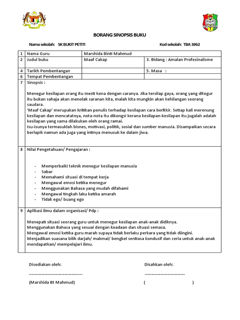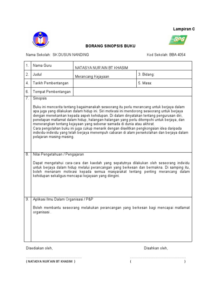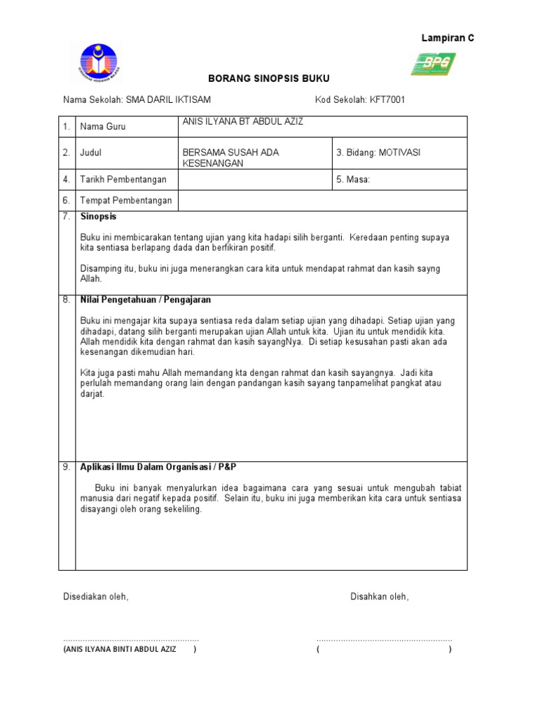 New Contoh Borang Sinopsis Buku Splkpm Sks Pdf